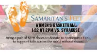 300 million children around the world do not own shoes or socks. The Women's Basketball team is participating in a new sneaker drive, benefiting Samaritans Feet. New sneaker and sock donations will be collected in the Walsh Gymnasium lobby at the Sunday, January 22nd game against Syracuse at 2:00 PM. The goal of Samaritan's Feet is to provide these children with shoes and socks. We encourage all fans to bring a pair of new shoes and/or socks to the game to help support this great foundation.