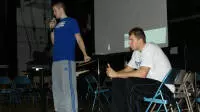 Patrik Auda (Brno, Czech Republic) and Kyle Smyth (River Edge, N.J.) took time away from their busy class and practice schedules to visit the middle school and speak to their students about "Ticket To Reading Awards," a reading incentive program that encourages middle school students to read books outside the classroom and obtain rewards for reading. Spearheading the program on Seton Hall's side was director of basketball operations Stephen Sauers, who also attended and took part in the presentation.