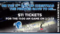 Seton Hall Athletics would like you to take advantage of the Eleventh Day til Christmas promotion! Purchase your $11 ticket to the Saturday, February 2nd game against Cincinnati at 11:00AM.
